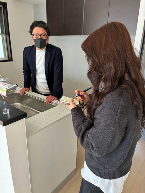 不動産事業部では、販売中の物件を見て回りながら、「現在のトレンドとなっている内装は何か?」「どれくらいの周期で内装の流行は変化するのか?」「なぜこの物件を購入したのか」など積極的に質問を重ねていました。リノベーション中の現場では、職人の作業や現場監督の役割について、動画を撮影したり、熱心にメモを取ったりしながら学んでいました。